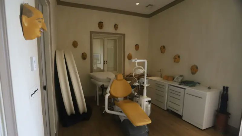 Bir odanın dişçi muayenehanesine benzediği ve duvarlarının ünlü tarihi figürlerin maskeleriyle dekore edilmesi dikkat çekti.