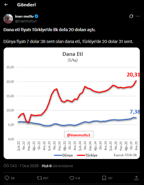 Ekonomist Inan Mutlu’nun paylaşımı, Türkiye’deki derinleşen geçim krizini bir kez daha ortaya koydu. Dünya genelinde kilogramı 7 dolar 38 sent olan dana eti, Türkiye’de 20 dolar 31 sene kadar yükseldi. Güncel kurla (43,05 TL) hesaplandığında, dana etinin kilosu yaklaşık 874 liraya denk geliyor.